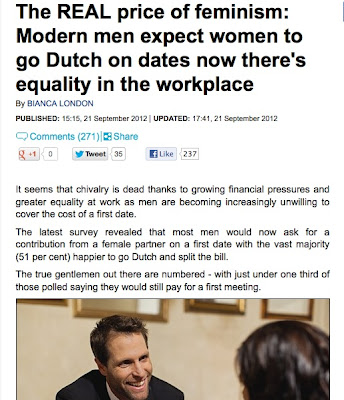 Shit, girls! The REAL price of equality: equality. If someone had told me that by being a feminist, I’d have to actually spend money, then I would have given up that pedantic little pastime a long, long time ago. The predictable outcry from the Fail was that ‘chivalry is dead’, which means that you can’t even expect your boyfriend to turn up in a full suit of armour on a first date anymore, never mind pull out your chair and stop himself from calling you a brazen hussy for venturing out alone past 6pm. However, it’s not all bad news: as per the article above, feel safe in the knowledge that he’ll be happy to ‘fat-shame’ you (hopefully publicly) if you put on a couple of pounds, so you’ll always stay in shape!
