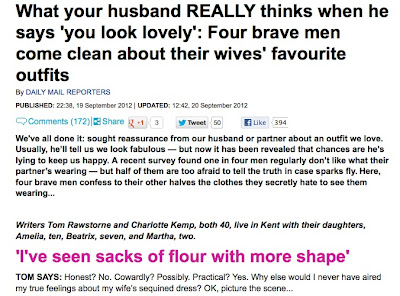 Just in case you’re not confused enough about your relationships and station in life following the plethora of horseshit that the Fail has rained down upon you all week as it simultaneously humps your mouth with the patriarchy, here’s one for you from the Femail section. Essentially, ‘stuff your husband didn’t like about you that you didn’t even know: the clothes edition’, which follows on nicely from the other things your husband doesn’t like if you follow this section regularly, you poor, poor masochist (a quick summary: you earning money, you dyeing your hair, you not dyeing your hair, you not staying at home with the children, you cooking, you not cooking, you putting on weight, you losing too much weight, you wanting children, you not getting pregnant fast enough.)