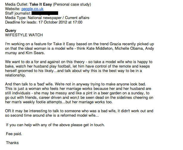 We thought this Wifestyle bollocks had died a death by now, but judging by this media request sent by one of our moles, it looks as though it’s still got a while to go before rigor mortis sets in. Sometimes we think that we should recruit a crack team of kamikaze feminists to volunteer for these pieces and then destroy them from within. Any takers? You’ll not only get a fee but, if it’s the Mail, a jewel coloured satin dress with matching heels of your choice. Go on, you know you want to…