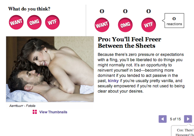 2. By the way, are those ‘want’ ‘OMG!’ and ‘WTF?’ buttons an actual feature from the magazine? Is that what Cosmo has reduced women’s set of permissible responses to? Want and two different strengths of shock? What about a button representing some type of disagreement? Also will this be a feature of all future Cosmo articles?