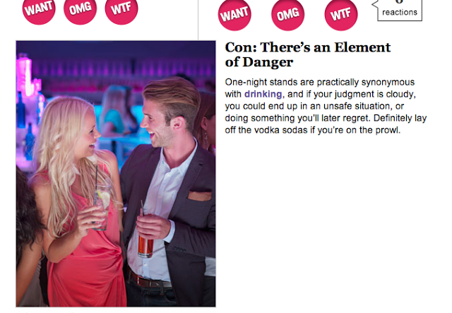 3. Imagine that “just please yourself” thing if it was directed at men. It’d go straight to “you can be a lousy sex partner, even a rapey one, but hey, it’s a one night stand, who cares about pleasing her?” It sucks just as much either way. Funny, I thought sex was ideally about *mutual* pleasure, not about encouraging people to be selfish creeps. Way to go, Cosmo.