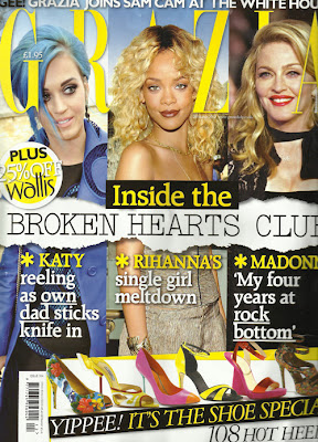We kick off with “INSIDE THE BROKEN HEARTS CLUB”. A private members’ club of three not dissimilar to Soho House, the Broken Hearts Club, according to the Grazi administration, consists of Katy (Perry), Rihanna, and Madonna, all of whom are single and seemingly not loving it. Because no one at Grazia HQ is single and loving it, remember? A good husband is not only mandatory for a successful career but also for your mental health (see: “Rihanna’s Single Girl Meltdown.) Here Grazia have to do some furious back-peddling as it emerges that, actually, Rihanna ISN’T getting back together with her abusive ex-boyfriend, as was “widely reported” earlier this year (BY YOU, YOU TWATS! See: “WHY RIHANNA WHY?”) Basically, she’s damned if she does and damned if she doesn’t. As is Madonna, who’s decision to split from Guy is apparently “HER GREATEST FAILURE.” Funny, I would have said her God-awful rendition of American Pie was but what do I know?