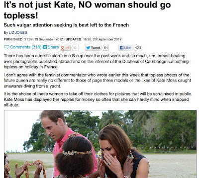 Other choice headlines surrounding this non-issue included ‘Looking meatier!’, in a clever reference to her meat-lined dress as well as her supposed weight gain; ‘Suddenly shy! Lady Gaga covers up her fuller figure’ (bizarre, considering the totally non-destructive attention the media has given to it), ‘Lady Gaga flaunts head tattoo – but hides fuller frame’ (the coy, irrational cocktease), and, of course, ‘Kelly Osbourne claims Lady Gaga is pregnant.’ Magnified and possibly Photoshopped pictures of the singer’s fishnet-clad behind are plastered across each of these articles – but they won’t stoop to reproducing Kate’s boobies, everyone. That’s modern morality for ya.