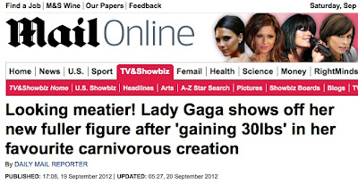 In an article that memorably featured the line ‘Despite her weight gain, Lady Gaga was polite to her fans’ – a tweeted favourite of Hadley Freeman, no less – the Fail ran five articles in the last two days on how much weight they presume Lady Gaga has put on during her latest tour. ‘I love pizza and pasta!’ ran one particularly mind-numbing headline. Once we all got over the shock of Mama Monster’s freakish tastebuds (pizza and pasta, you say? Get her off to the asylum with all the other female hysterics!), a ‘Daily Mail Reporter’ who chose to remain nameless got on with some classic ‘fat-shaming’ tactics, replete with unflattering imagery taken from Gaga’s various shows in the last few months.